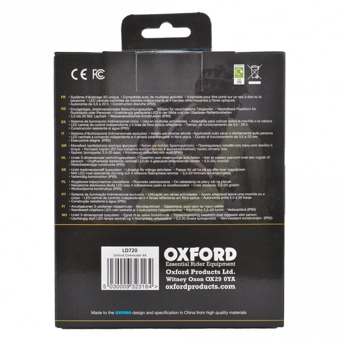 The Oxford Commuter X4 is a revolution in wearable lighting. Its unique design means the user can be seen clearly from various viewing angles, whilst the distinctive fibre optic straps also improve spatial awareness; helping other road users judge your speed and distance more accurately.
