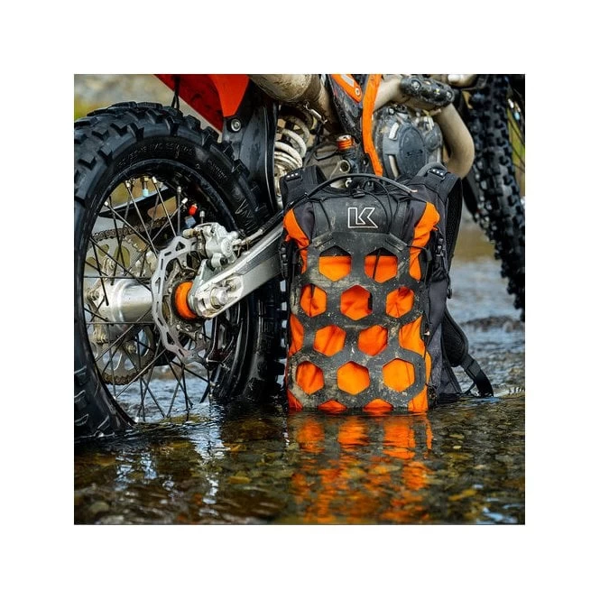 Composed of three sections: A heavy-duty zip access 7-litre rear compartment which is a perfect storage area for a Tool-Roll and water bottle or the optional 3.75L Hydration Reservoir. This area also has a small internal waterproof pocket for a phone and wallet, combined with the main roll-top body providing a total of 12-litres 100% waterproof storage. The innovative Hypalon net also provides more external storage for wet gear.